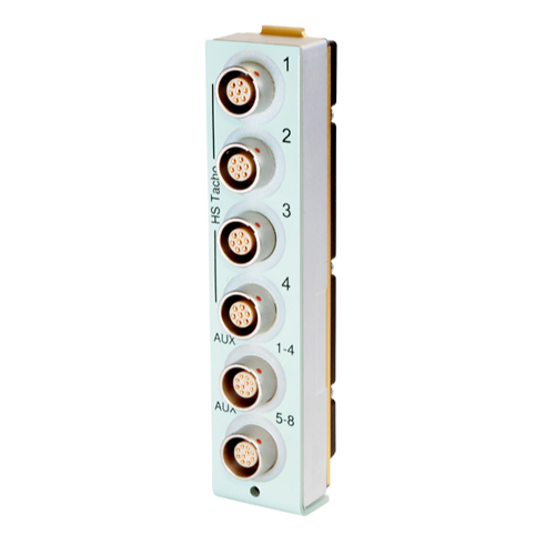 Cuenta con 4 conectores LEMO (7 pines) para micrófonos de 200 V y 2 conectores LEMO de 10 pines para entradas de señal auxiliar de 8 canales.