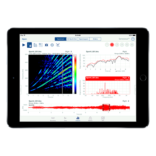 El iPad puede montarse en un tablero de instrumentos en vehículos, donde los botones grandes y las pantallas claras le ayudan a controlar las pruebas y ver las señales acústicas, de vibración, del tacómetro y del CANbus. Durante las mediciones puede guardar capturas de pantalla de los datos mostrados tocando un solo botón. También puede tocar la pantalla para marcar eventos importantes y períodos de tiempo. Sonoscout mapea la ruta automáticamente usando el GPS y muestra los eventos marcados en Google Earth ™ más tarde, junto con la ubicación de los marcadores de eventos. Además, puede comenzar a generar su informe directamente en el iPad usando cualquiera de las aplicaciones de Microsoft Office®. Después de grabar, puede reproducir historias de tiempo de inmediato y validar datos explorándolo con las yemas de los dedos, escuchando repeticiones de dos canales y comparándolo con otras pruebas y vehículos.