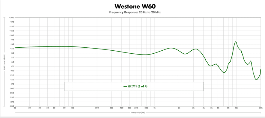 Si no había escuchado el Westone W60 antes de ver estas mediciones, lo que ve (en cada una de las mediciones en las imágenes 4 a 7 anteriores) sugeriría que, por encima de 5 kHz, el balance tonal del W60 se caracteriza en gran medida por los 10 a 18 decibeles pico centrado en 8 kHz a 10 kHz, así como los efectos del pico a través de sus periferias inferiores y superiores. Esto se debe a una resonancia que en realidad es parte de la norma 711.